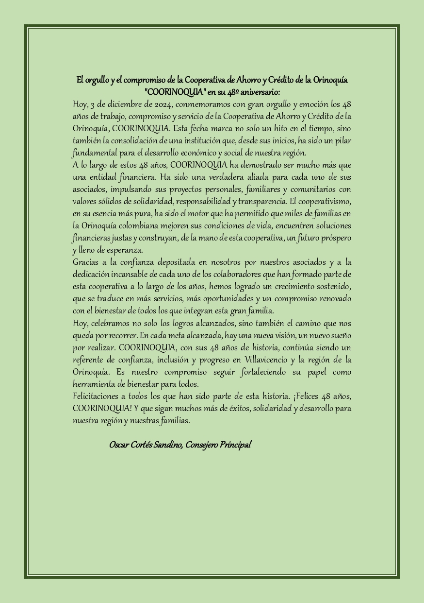 Hoy, 3 de diciembre de 2024, conmemoramos con gran orgullo y emoción los 48 años de trabajo, compromiso y servicio de la Cooperativa de Ahorro y Crédito de la Orinoquía, COORINOQUIA. Esta fecha marca no solo un hito en el tiempo, sino también la consolidación de una institución que, desde sus inicios, ha sido un pilar fundamental para el desarrollo económico y social de nuestra región. A lo largo de estos 48 años, COORINOQUIA ha demostrado ser mucho más que una entidad financiera. Ha sido una verdadera aliada para cada uno de sus asociados, impulsando sus proyectos personales, familiares y comunitarios con valores sólidos de solidaridad, responsabilidad y transparencia. El cooperativismo, en su esencia más pura, ha sido el motor que ha permitido que miles de familias en la Orinoquía colombiana mejoren sus condiciones de vida, encuentren soluciones financieras justas y construyan, de la mano de esta cooperativa, un futuro próspero y lleno de esperanza. Gracias a la confianza depositada en nosotros por nuestros asociados y a la dedicación incansable de cada uno de los colaboradores que han formado parte de esta cooperativa a lo largo de los años, hemos logrado un crecimiento sostenido, que se traduce en más servicios, más oportunidades y un compromiso renovado con el bienestar de todos los que integran esta gran familia. Hoy, celebramos no solo los logros alcanzados, sino también el camino que nos queda por recorrer. En cada meta alcanzada, hay una nueva visión, un nuevo sueño por realizar. COORINOQUIA, con sus 48 años de historia, continúa siendo un referente de confianza, inclusión y progreso en Villavicencio y la región de la Orinoquía. Es nuestro compromiso seguir fortaleciendo su papel como herramienta de bienestar para todos. Felicitaciones a todos los que han sido parte de esta historia. ¡Felices 48 años, COORINOQUIA! Y que sigan muchos más de éxitos, solidaridad y desarrollo para nuestra región y nuestras familias.